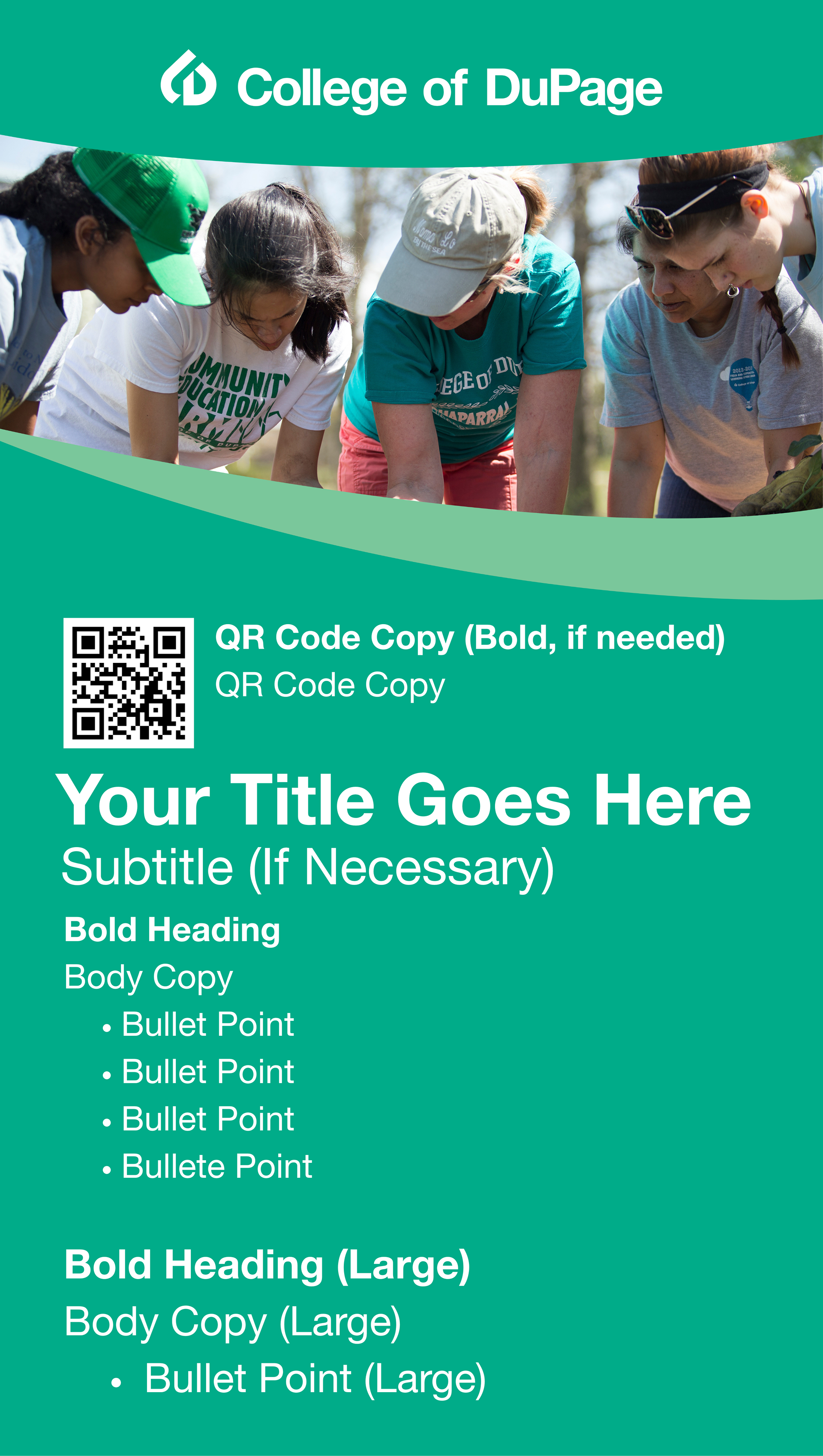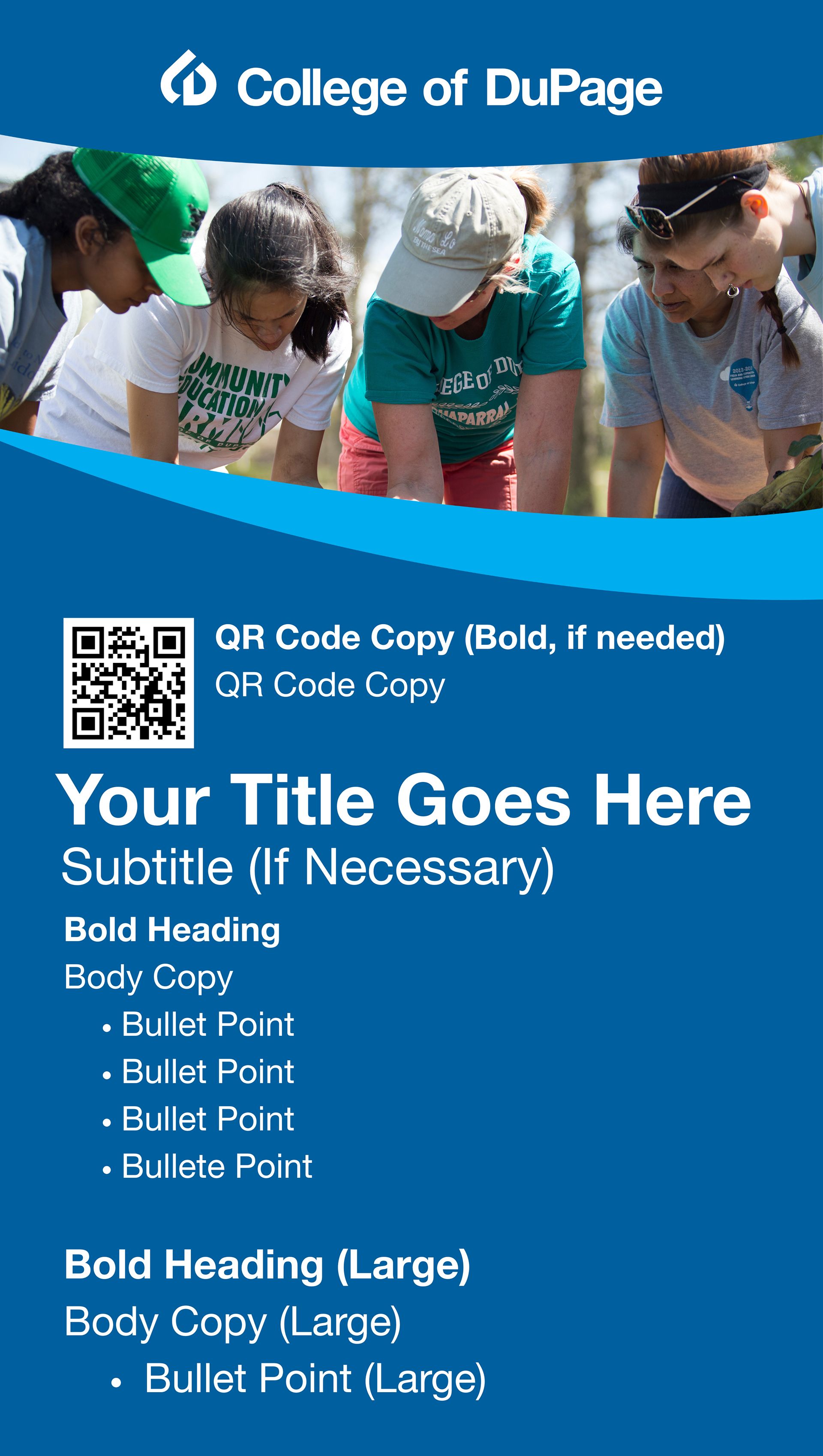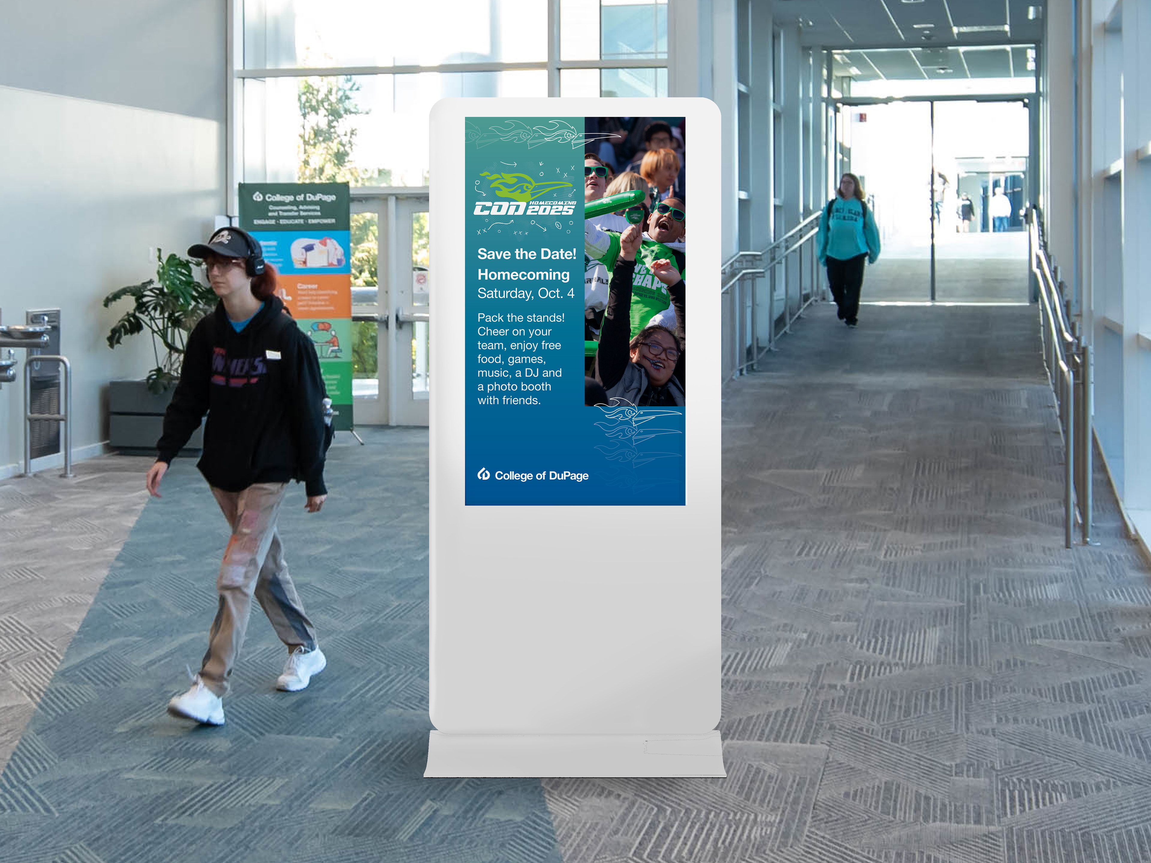 On a campus where flyers, posters, and handouts can easily blend into the background, digital kiosks offer a dynamic way to grab student attention quickly. By first building kiosk templates in InDesign and then refining them in Canva, I focused on creating designs that were eye-catching, clear, and approachable, helping the messages stand out and connect with students in a meaningful way. Each template incorporated variations in color, copy length, and layout to provide variety and uniqueness, while still aligning seamlessly with the College of DuPage brand.