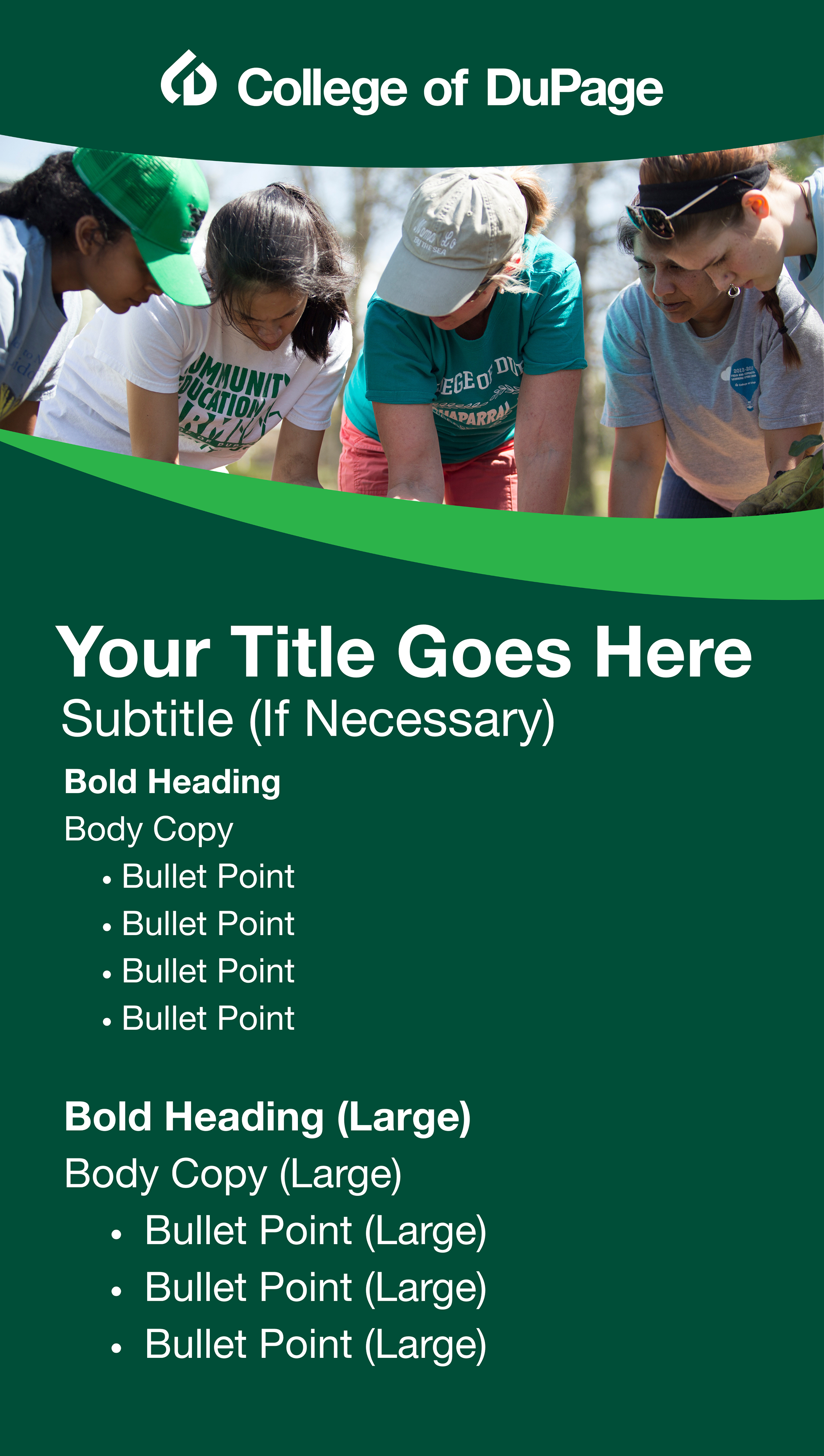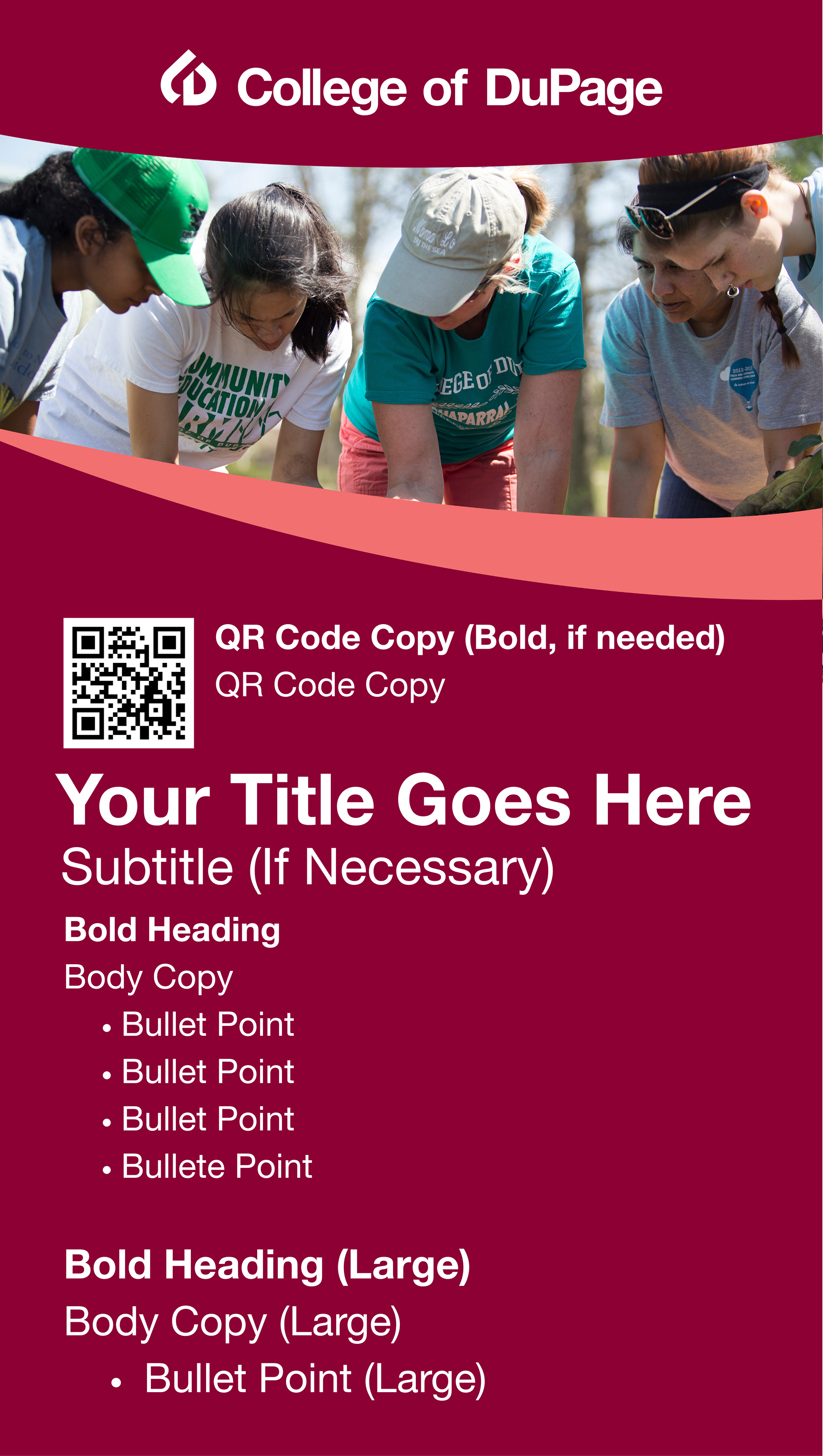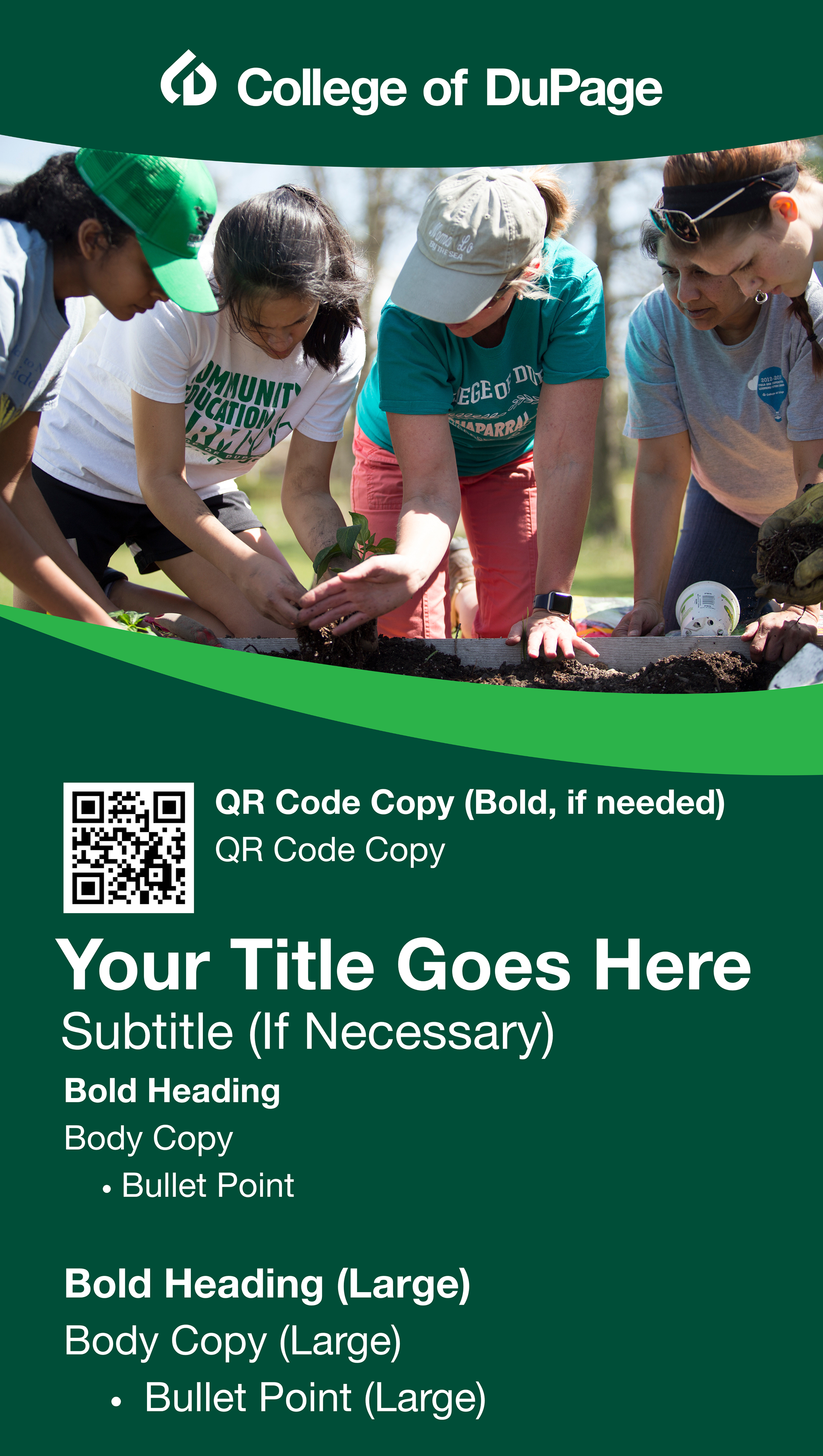 On a campus where flyers, posters, and handouts can easily blend into the background, digital kiosks offer a dynamic way to grab student attention quickly. By first building kiosk templates in InDesign and then refining them in Canva, I focused on creating designs that were eye-catching, clear, and approachable, helping the messages stand out and connect with students in a meaningful way. Each template incorporated variations in color, copy length, and layout to provide variety and uniqueness, while still aligning seamlessly with the College of DuPage brand.